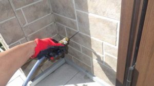 工事は玄関(外)の柱や玄関口、勝手口などに小さい穴をあけて薬剤を注入、床下にも薬剤の散布を
